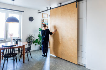 Byt pro mladý pár navrhuji s minimem úprav a bez větších zásahů do kuchyně a jádra. Malý byt dělím velkou posuvnou stěnou z překližky, která dle potřeby odděluje halu nebo kuchyň nebo zakrývá nově vzniklé úložné prostory. Při vstupu nás vítá průhled do obývacího pokoje, který přechází do jídelny. V kuchyni je nově místo na myčku a další úložné prostory, úložné zásuvky a skříně vznikají taktéž ve středu bytu přístupné ze společenské části ale i z předsíně. Navyšuji tak kapacitu pro ukládání, které je tolik potřeba. Ložnice zůstává klidnou částí bytu a do ní procházím vedle velké knihovny na míru. Po celé šířce místnosti pod okno umisťuji velký pracovní stůl pro oba majitele. Byt díky zásahům je vzdušný a příjemný. Jedná se o moji vůbec první celkovou rekonstrukci, děkuji moc za důvěru.